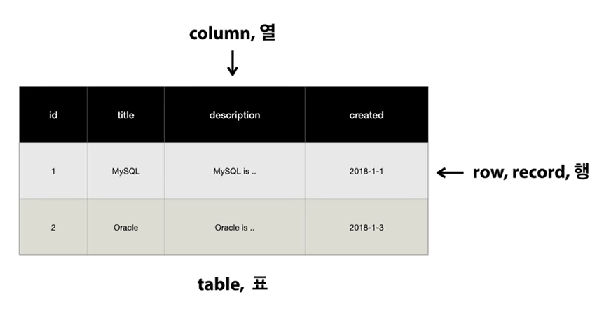 - table(표)에서 행은 row, record라 하고, 열은 column이라 합니다.