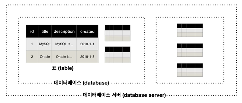 - mySQL의 구조는 데이터베이스 서버안에 데이터베이스(다른말로 스키마)안에 표(table)가 존재하는 형식입니다.