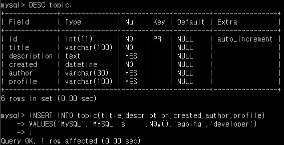 - SHOW TABLES; 를 입력해서 database안에 테이블을 확인할 수 있고, DESC topic; 을 입력해서 topic이라는 table이 어떻게 구성됐는지 확인할 수 있습니다.