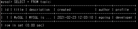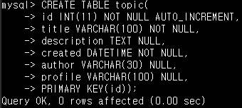 - SELECT * FROM topic; 을 입력해서 topic이라는 table의 row들을 볼 수 있습니다.