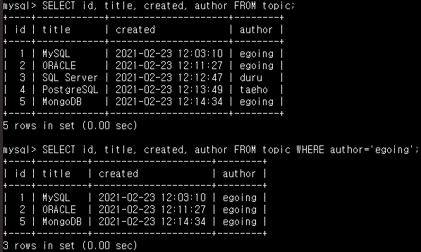 그리고 SELECT id, title, created, author FROM topic WHERE author='egoing; 를 입력하면, where뒤에 조건에 맞는 row가 출력됩니다.