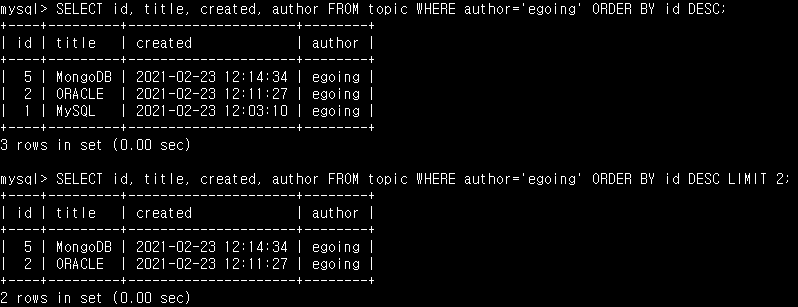 - SELECT id, title, created, author FROM topic WHERE author='egoing ORDER BY id DESC; 을 입력하면, id를 기준으로 내림차순 저렬하여 row를 출력해줍니다. 그리고 SELECT id, title, created, author FROM topic WHERE author='egoing ORDER BY id DESC LIMIT 2; 을 입력하면 최대 2개의 row가 출력됩니다.