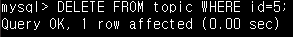 - DELETE FROM topic WHERE id=5; 를 입력하면 id가 5인 행이 제거됩니다.