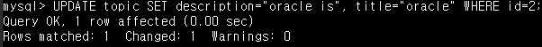 - UPDATE topic SET decription="oracle is", title="oracle" WHERE id=2; 를 입력하면, id가 2인 row의 desciption과 title을 변경할 수 있습니다.