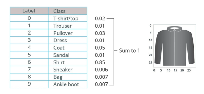 - These 10 output values refer to probabilities. These 10 numbers are also called the probability distribution or in other words, a distribution of probabilities for each of the output classes of clothing, all summing up to one.